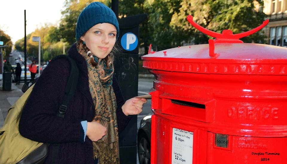 Posting a letter home to Germany from Glasgow today the lovely student Ida (pronounced Eeda )who works in Oran Mor in order to eat!